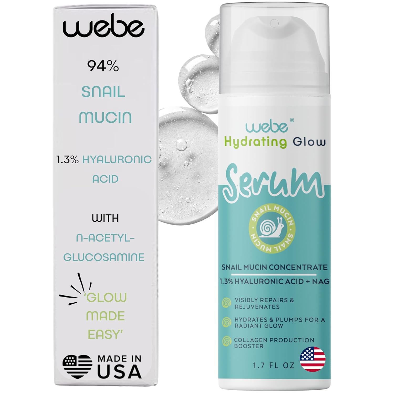 WEBE Naturals Snail Mucin 94% Hydrating Glow Serum | 1.3% Hyaluronic Acid & N-Acetyl Glucosamine | Collagen Boosting, Plumping, Anti Aging, Intense Moisturizing Serum for Radiant, Dewy Skin