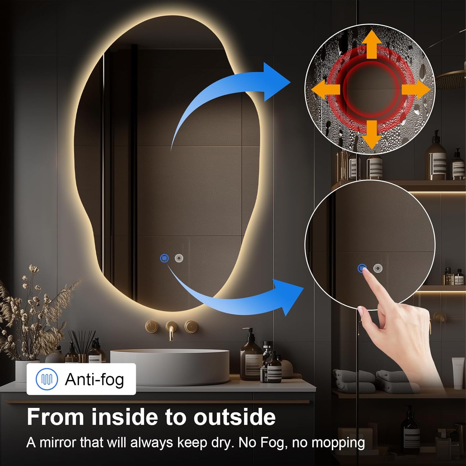 - Eco-friendly 5MM Asymmetrical Bathroom Mirror with Light: This LED bathroom mirror is made with copper-free, environmentally friendly materials and a silvered reflection layer for a clear and sharp image.