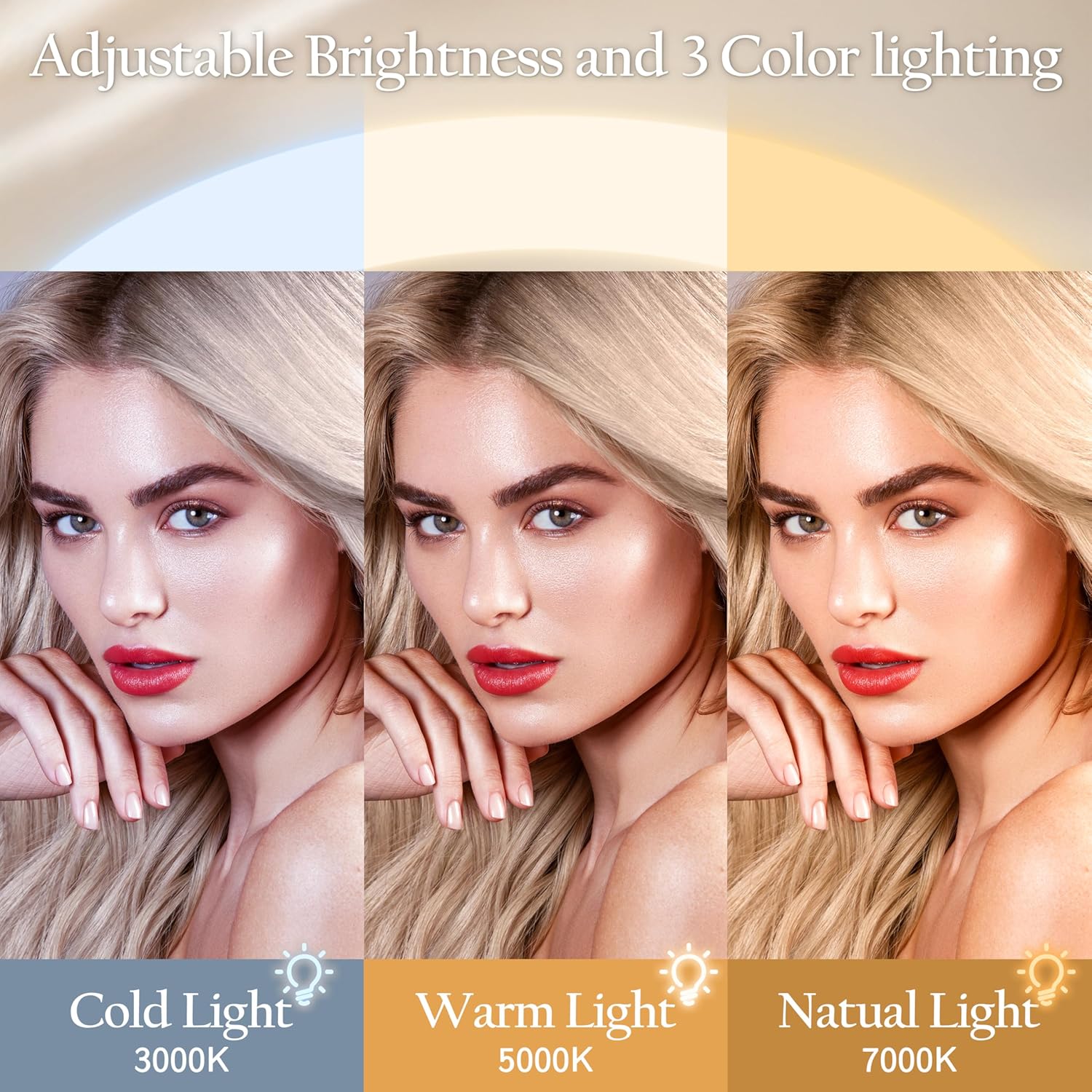 - 【3-Color Lighting & Stepless Dimming】Featuring three adjustable color settings (Cool White, Warm White, Natural White) for diverse makeup environments. Effortlessly slide your finger for precise brightness control (0-100%), ensuring shadow-free, even illumination every time.