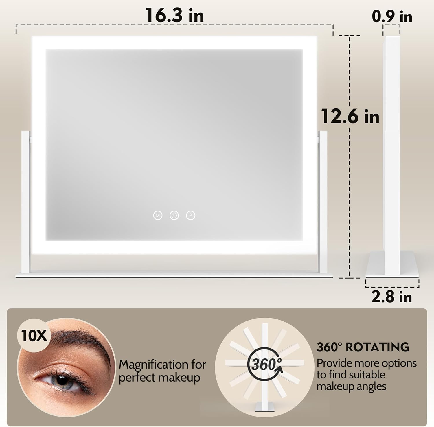 Lighted Makeup Mirror, 16.3"x12.6" Hollywood Vanity Mirror with Lights, 10X Magnification, 3 Color Lighting Modes, Smart Touch Control, 360° Rotation for Bedroom or Tabletop (White)