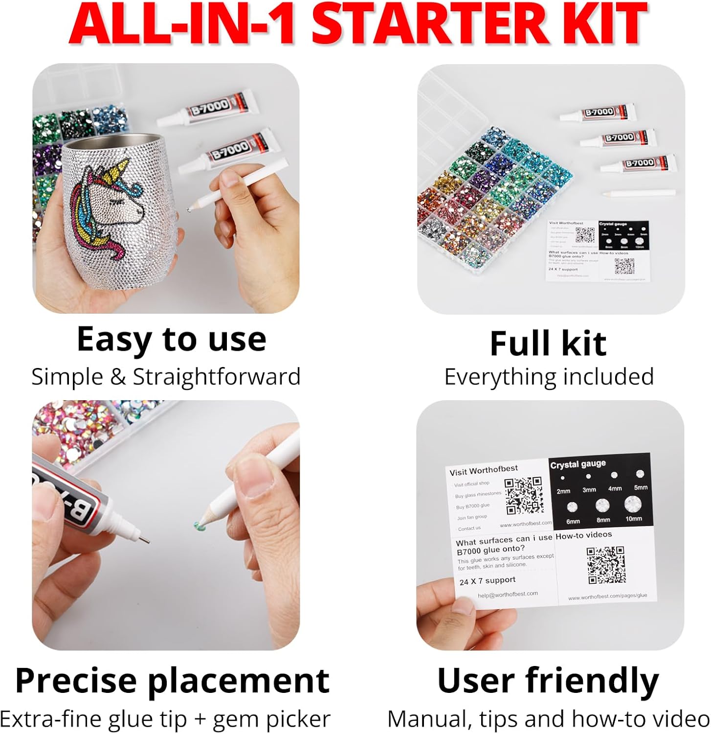 - Easy to Use -- This kit is designed to be straightforward, and versatile for various crafting projects. The manual is user-friendly and beneficial for both novice and experienced crafters. The complete and durable tools are suitable for precisely applying rhinestones to create intricate designs, with no additional tools required. Rhinestones are easy to apply and remove. The sturdy container with 24 grids keeps all rhinestones organized by size and color, making them easy to store and access