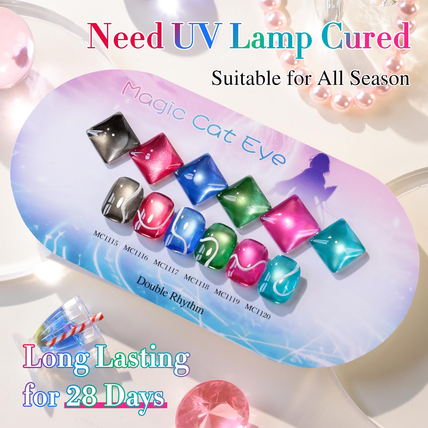 Double Rhythm Cat Eye Gel Nail Polish Set of 6 Same Color Same Bottle 0.5 Oz Shimmer Glitter with Magnet Holographic Reflective Magnetic UV Polish Kit at Home (Black Red Green Navy-T6-44)