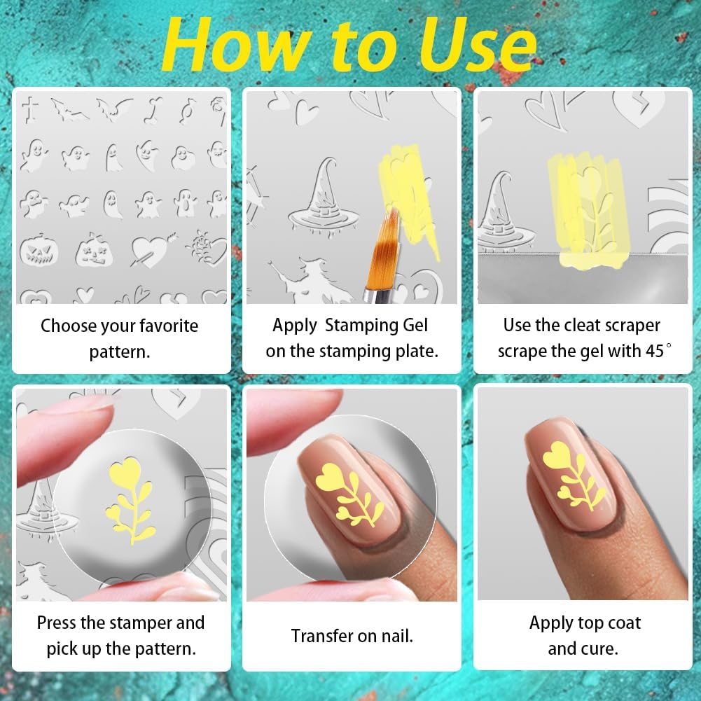 - Package Information: A total of 3 templates, 1 nail stamp and scraper, Halloween, Christmas, Valentine's Day, Thanksgiving, Easter patterns, randomly collocation, leading the nail fashion, the world at your fingertips jump