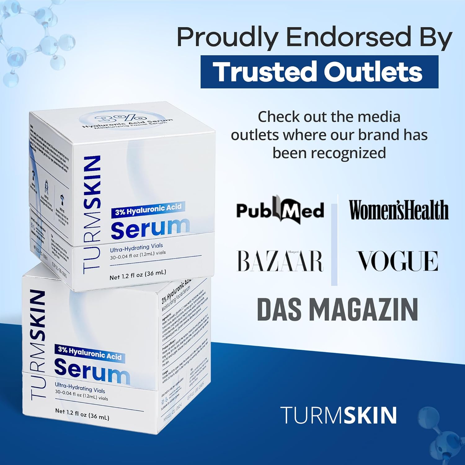 TURMSKIN® Hyaluronic Acid Serum Ampoules [ULTRA HYDRATING VIALS] - 3% Hyaluron Booster for Glass Skin & Anti Aging - 24 Hours Hydration - Soft PE Triple Hyaluronic Complex for Faceskin Repair & Renew