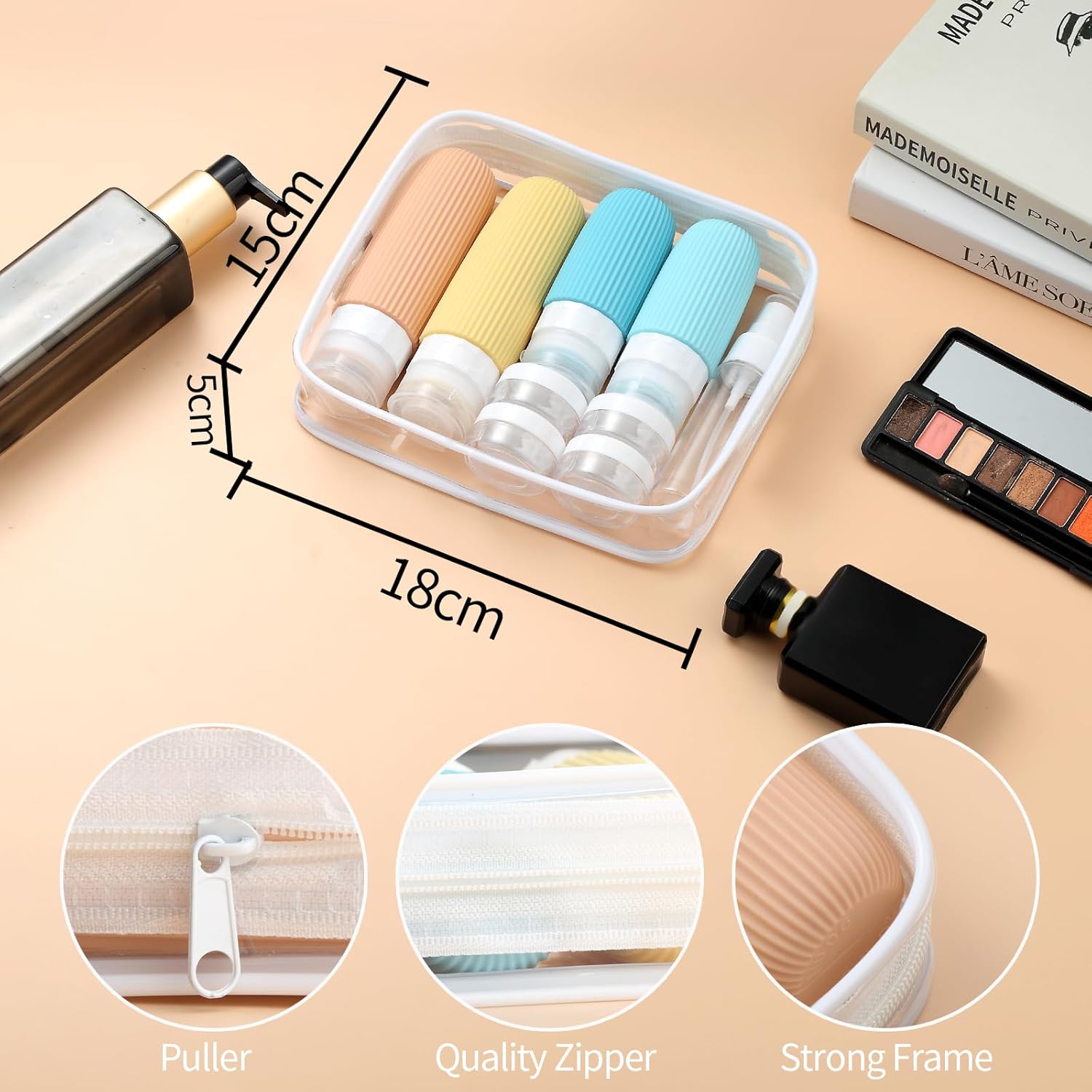 - Useful Travel Accessories: This is a nice assortment of travel containers in a useful zip case. ( Come in 4 Travel Bottles+4 Travel Jars+2 Spray Bottles+2 Scoopers+1 Funnel+1 Clean Brush + 1 Page Label + 1 Clear Toiletry Bag ) Multiple ones allow you take along different beauty products and toiletries according to your requirement
