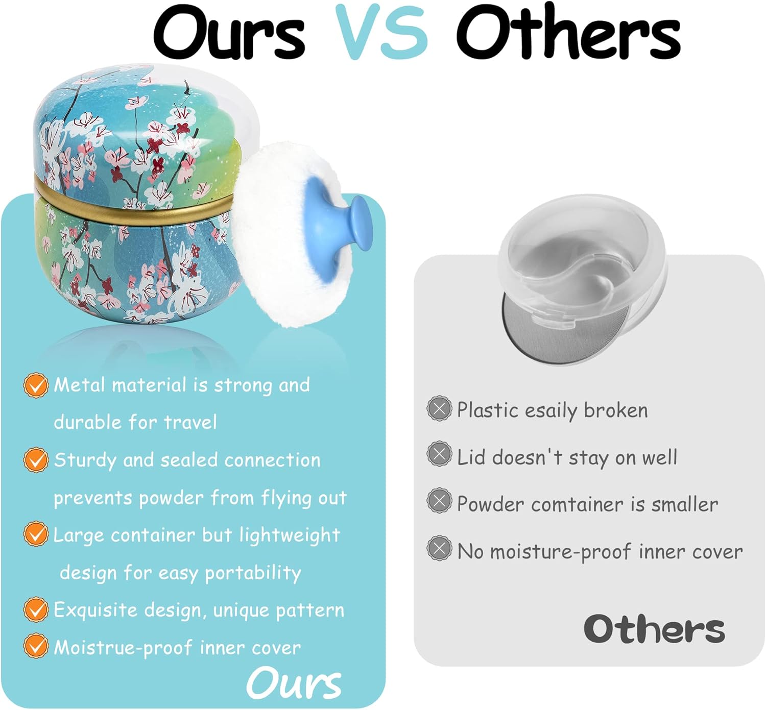 - Product contains a well-made powder case, a high quality powder puff with a handle and a small powder puff.