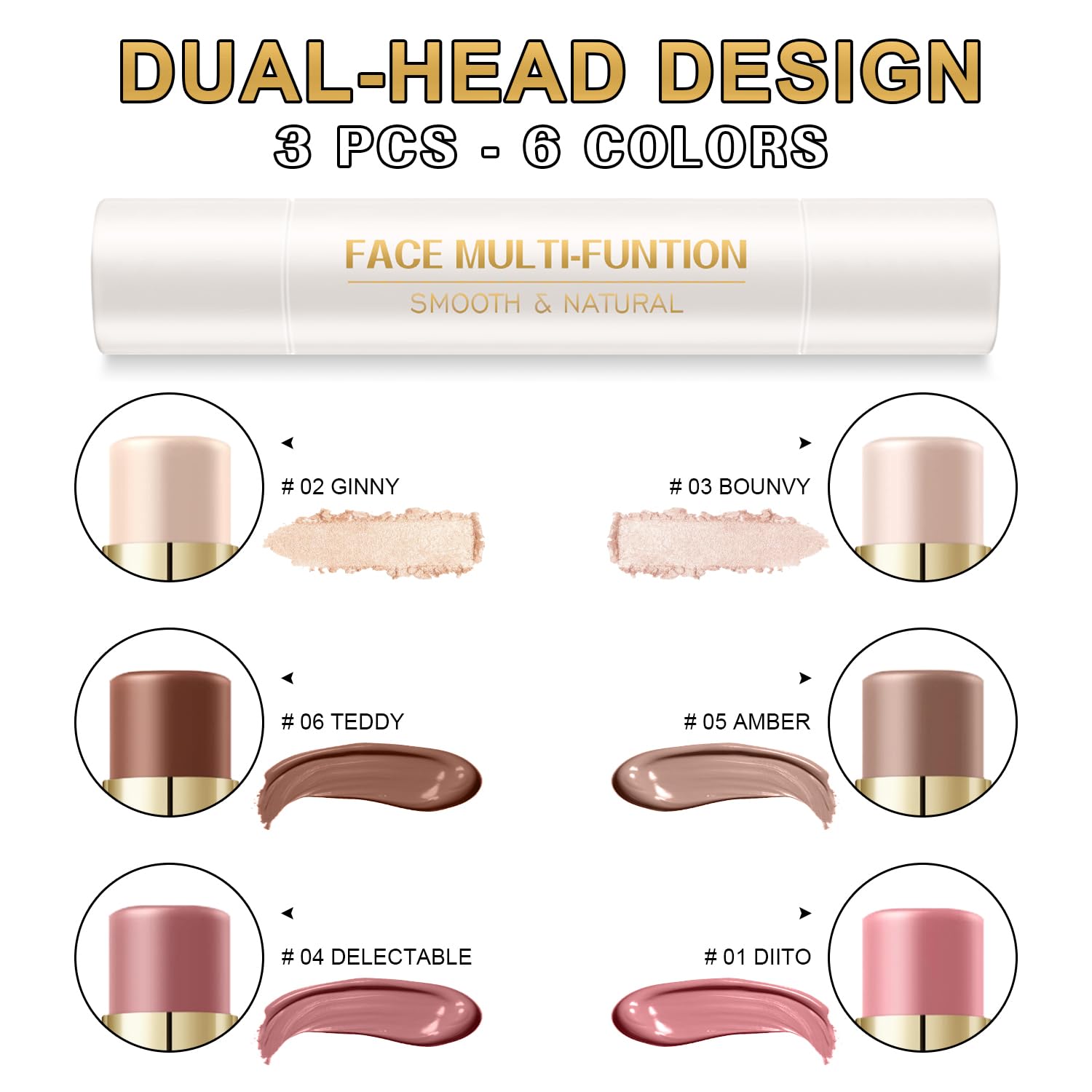 - 【Multi-Functional Shades for Every Skin Tone】Includes universal contour, highlight, and blush shades to brighten, slim, and add dimension. Use the cool-toned sticks for natural shadows, warm bronzers for sun-kissed warmth, and rosy blushes for a healthy glow. Works on fair to deep complexions!
