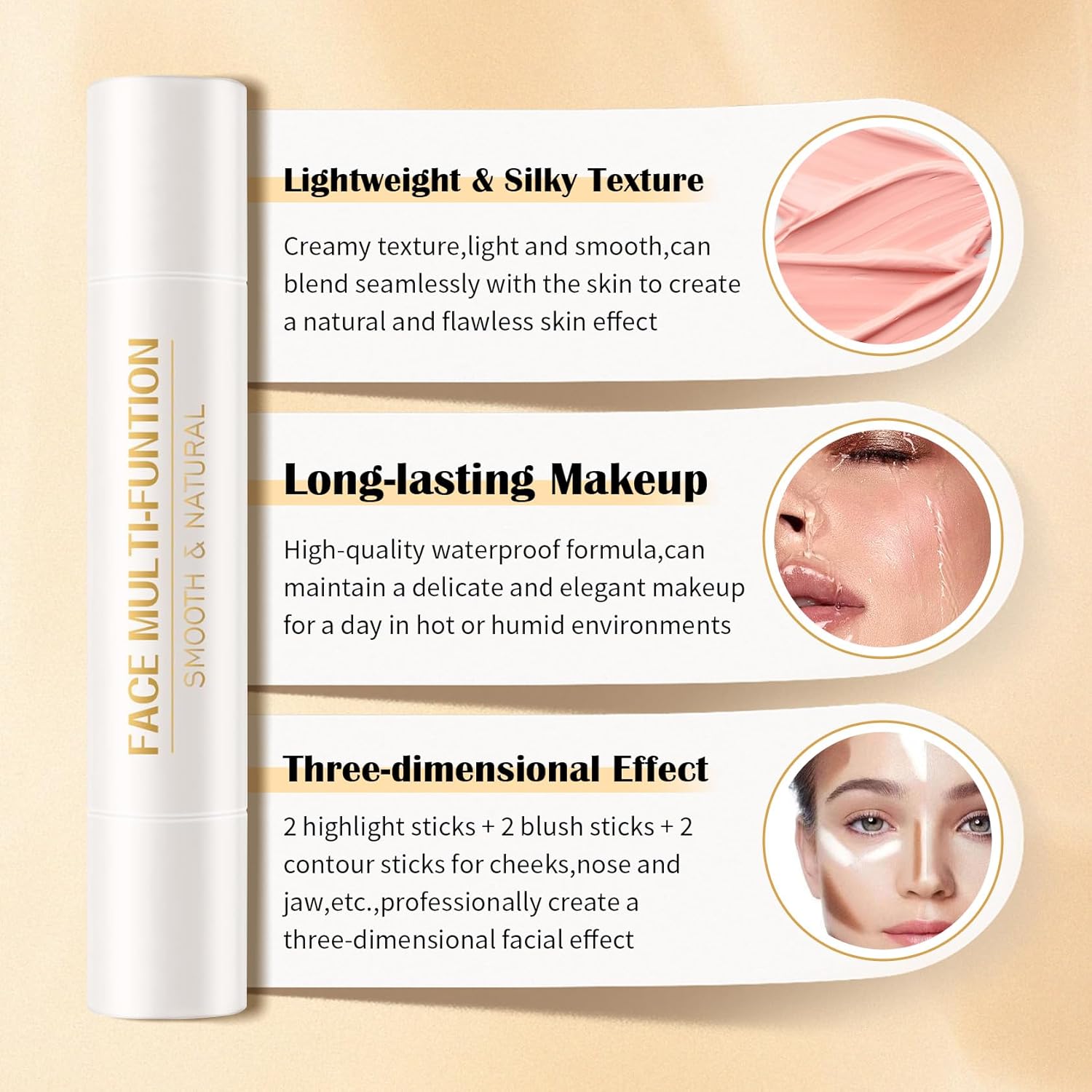 - 【Versatile Shade】Highlight sticks enhance facial features,making the skin translucent and natural;contour sticks create three-dimensional shadows and adjust facial proportions;dark and light blush sticks are suitable for different makeup needs and enhance the layering of facial colors