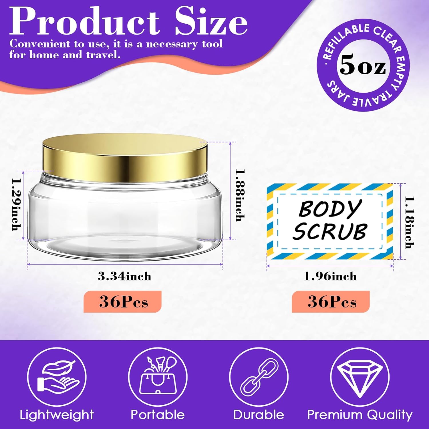 36 Pack 5 oz Plastic Cosmetic Containers With Lids Refillable Clear Empty Travle Jars Containers for Body Butter,Sugar Scrubs,Cream,Lotions,Candy, Waterproof Label&Spatulas - (Black Lid)