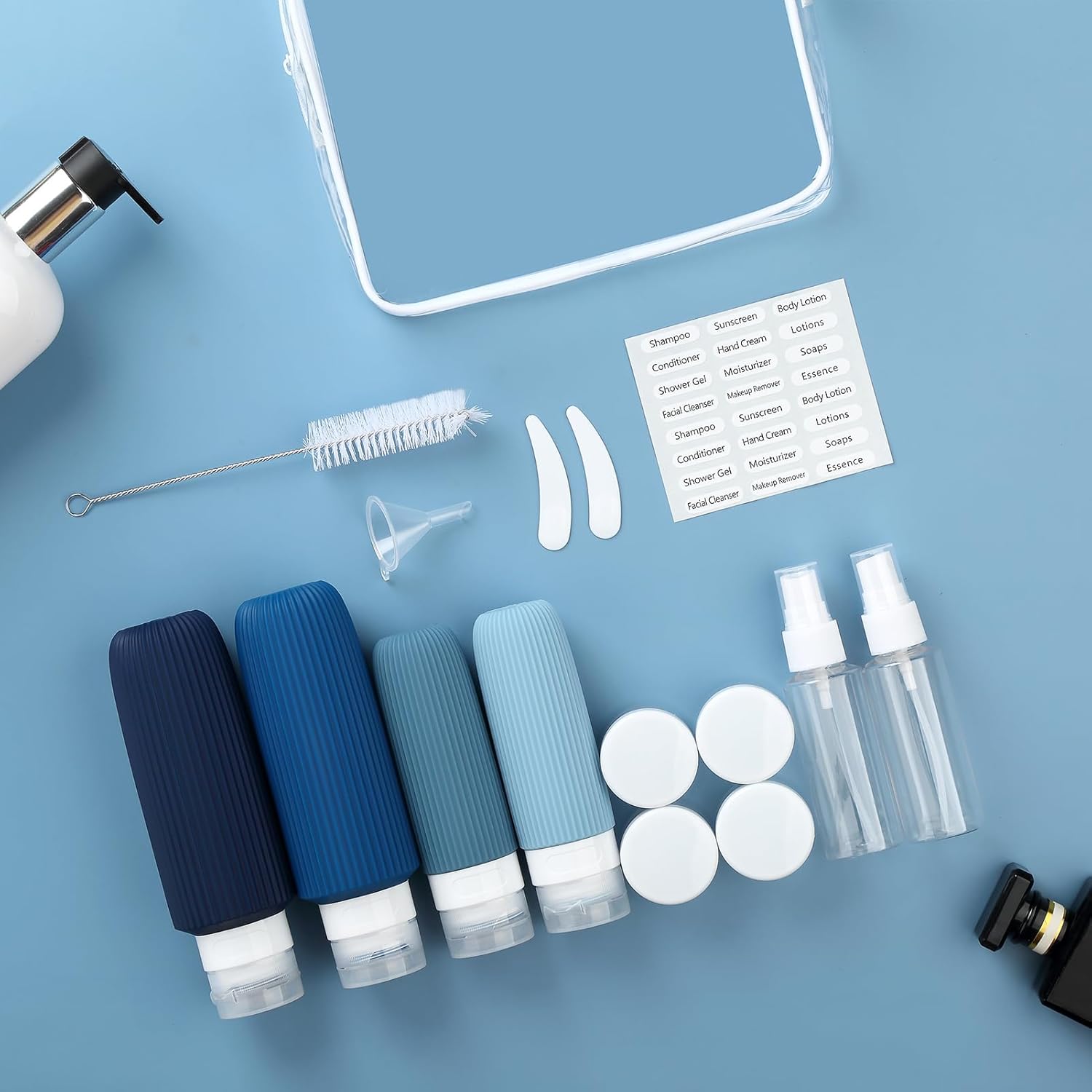 - Useful Travel Accessories: This is a oversize assortment of travel containers in a useful zip case. ( Come in 2 pcs Larege 6oz & 2pcs 3oz Travel Bottles + 4 Travel Jar s+ 2 Spray Bottles + 2 Scoopers + 1 Funnel + 1 Clean Brush + 1 Page Label + 1 Clear Toiletry Bag ) Multiple ones allow you take along different beauty products and toiletries according to your requirement