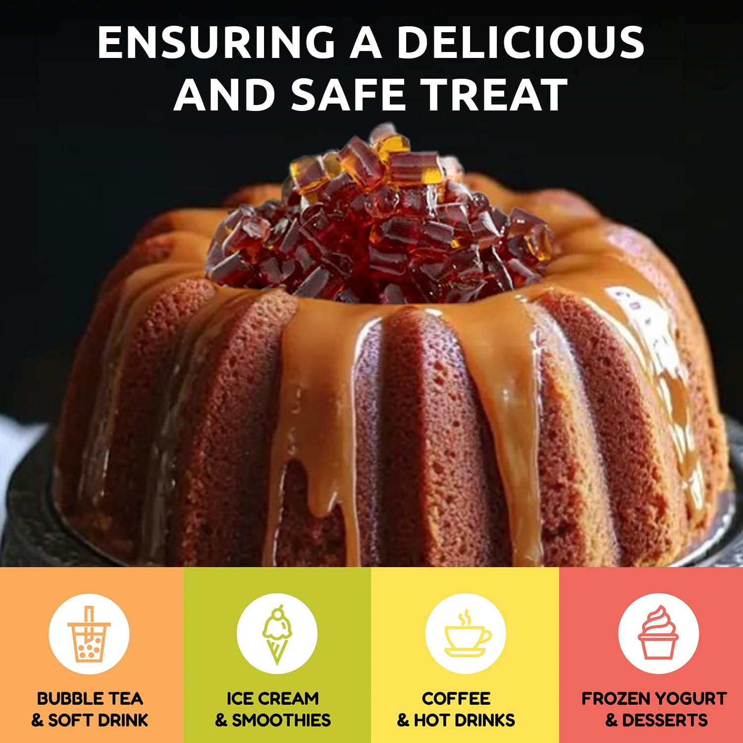 - 𝐕𝐞𝐫𝐬𝐚𝐭𝐢𝐥𝐞 𝐔𝐬𝐞:This boba tea jelly topping can be used in desserts like puddings, cakes, or tropical-themed pastries. It is also suitable for cocktails or mocktails, adding a unique texture and flavor to beverages and allowing chefs to experiment by using it as a base for creating innovative recipes