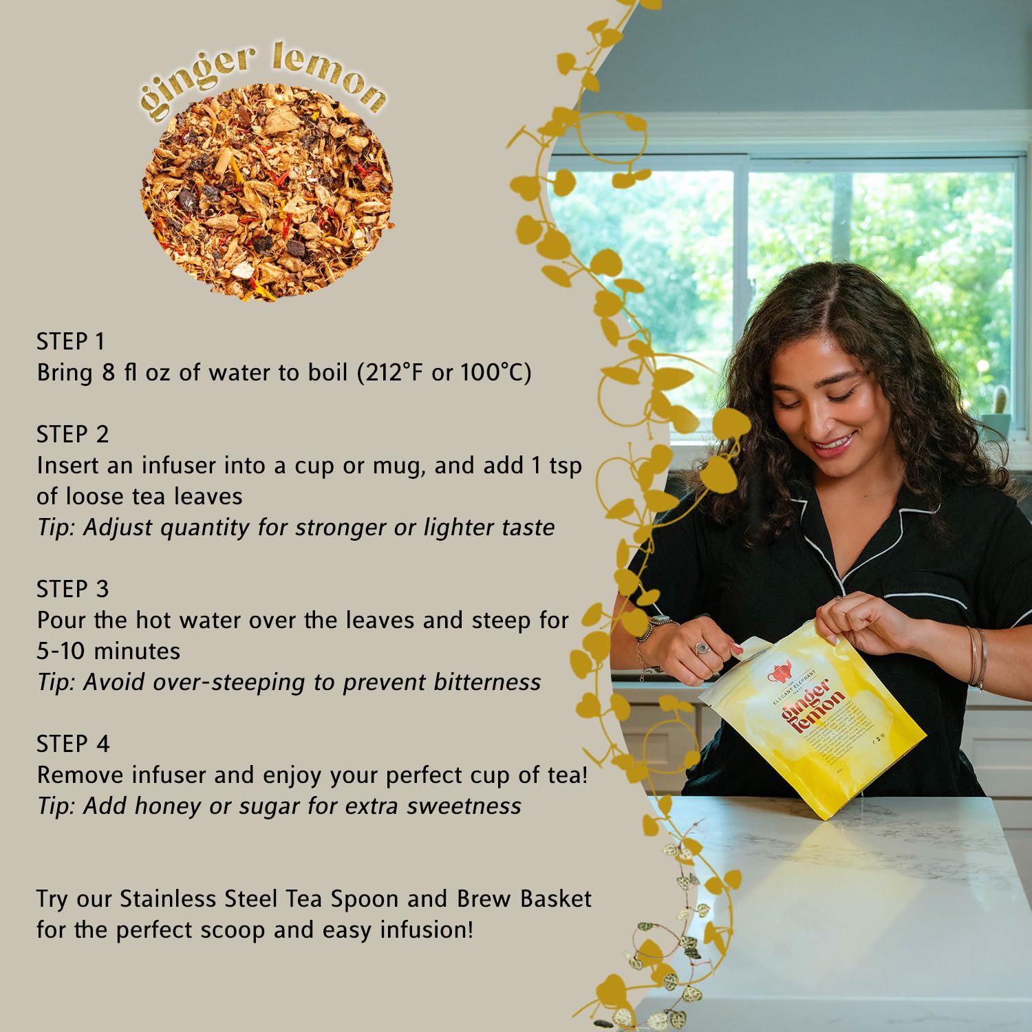 Ginger Lemon Tea, Loose Leaf Herbal Tea – Helps Reduce Nausea and Motion Sickness – Detox & Immunity Support – Drink Hot or Iced – 4 oz Resealable Bag (Makes 50 Cups) – The Elegant Elephant