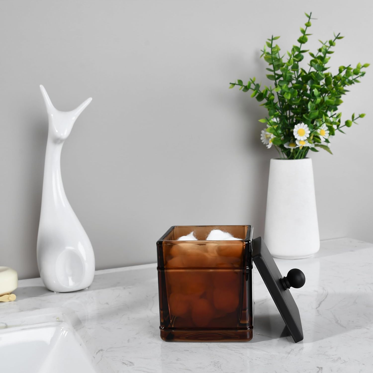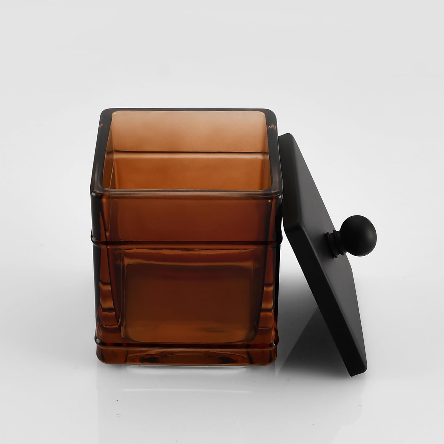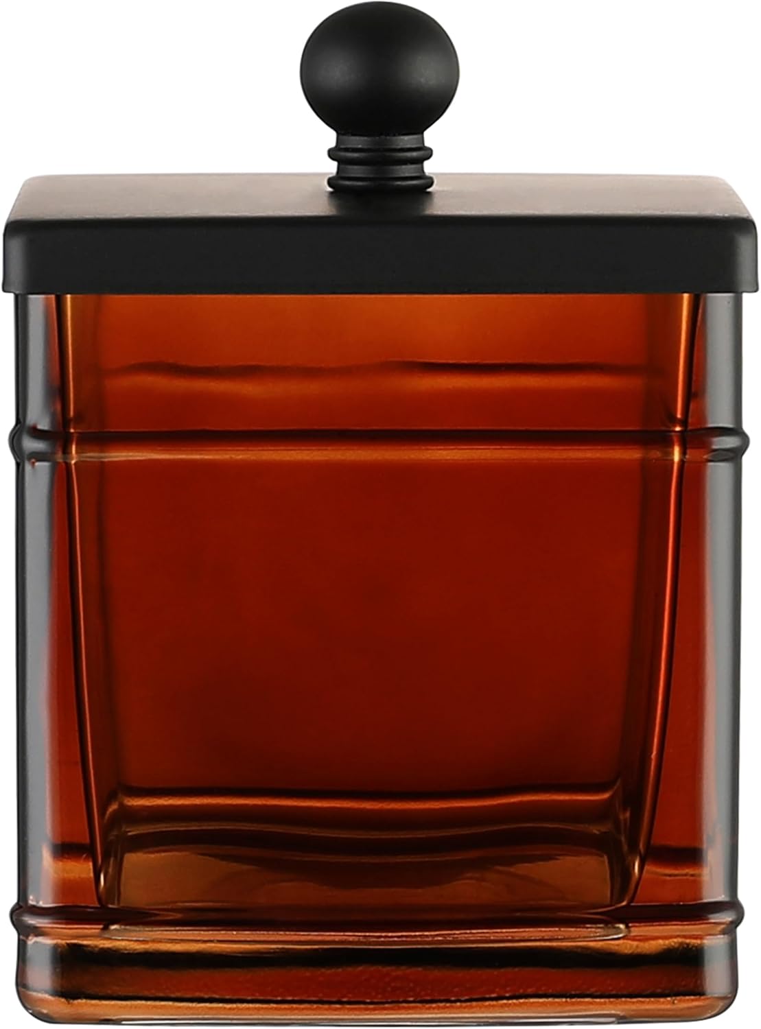 Amber Glass Cotton Jar Holder – Black Lid Elegant Bathroom Storage Canister for Qtips, Cotton Balls, Floss, Makeup Organizer, Vanity & Bathroom Organization