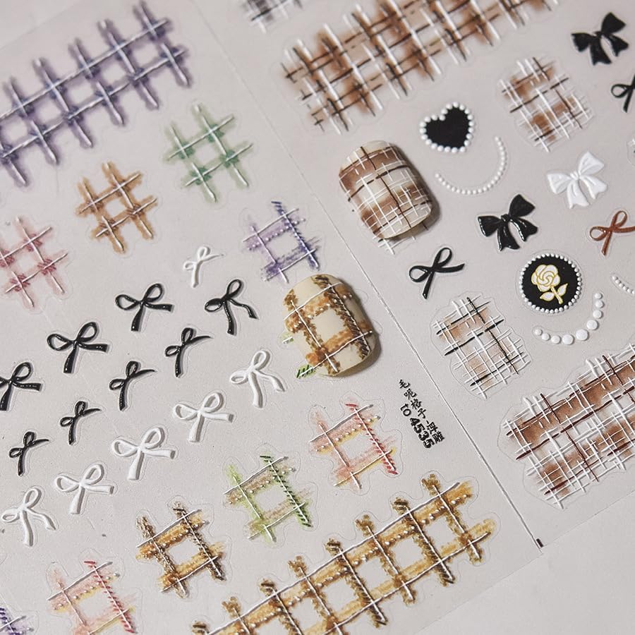 Colorful Grid Bow Nail Art Stickers 3D Embossed Fall Winter Nail Stickers, Self-Adhesive Durable Nail Art Decals for Women Girls, Nail Wraps Decoration Manicure for DIY Acrylic Nail Accessories