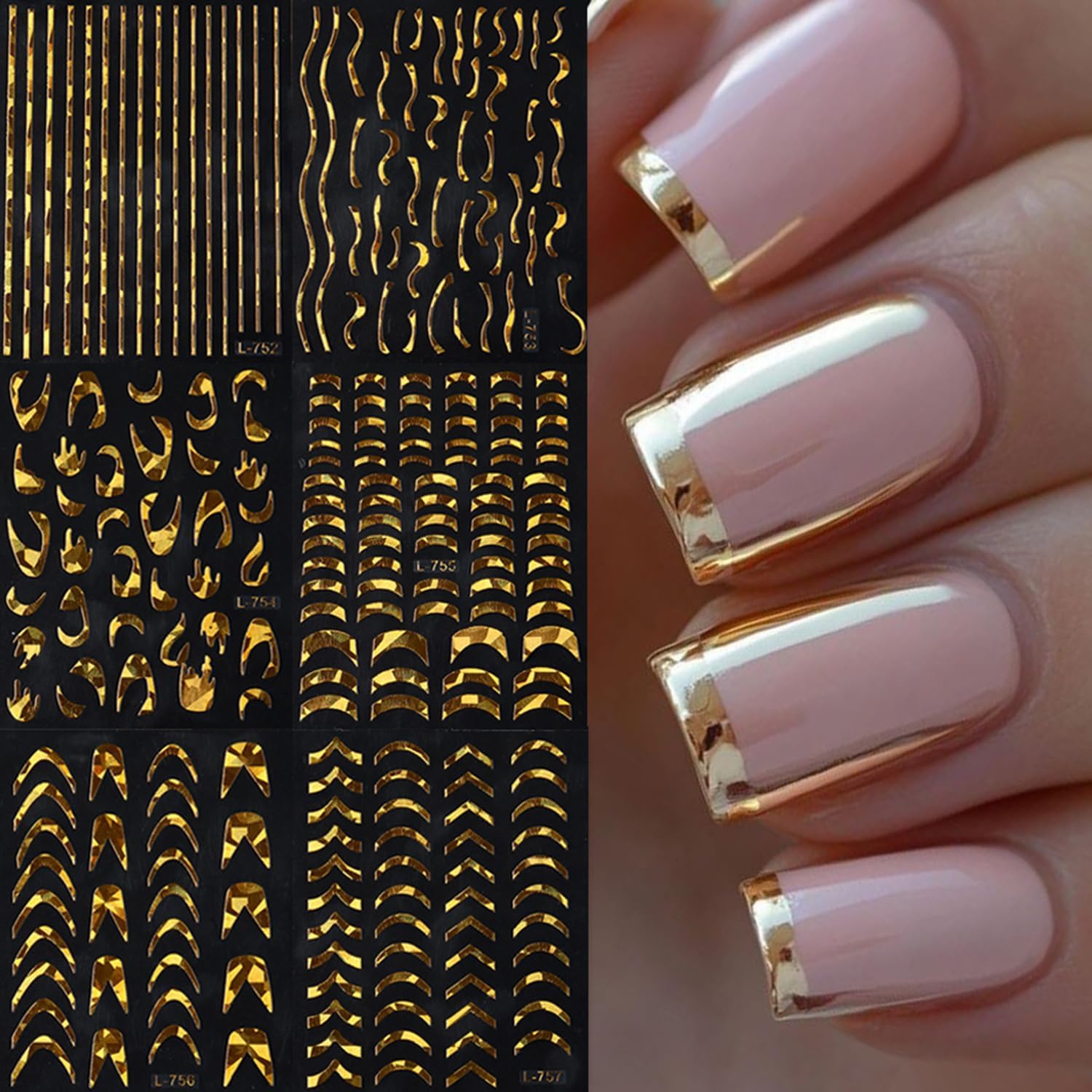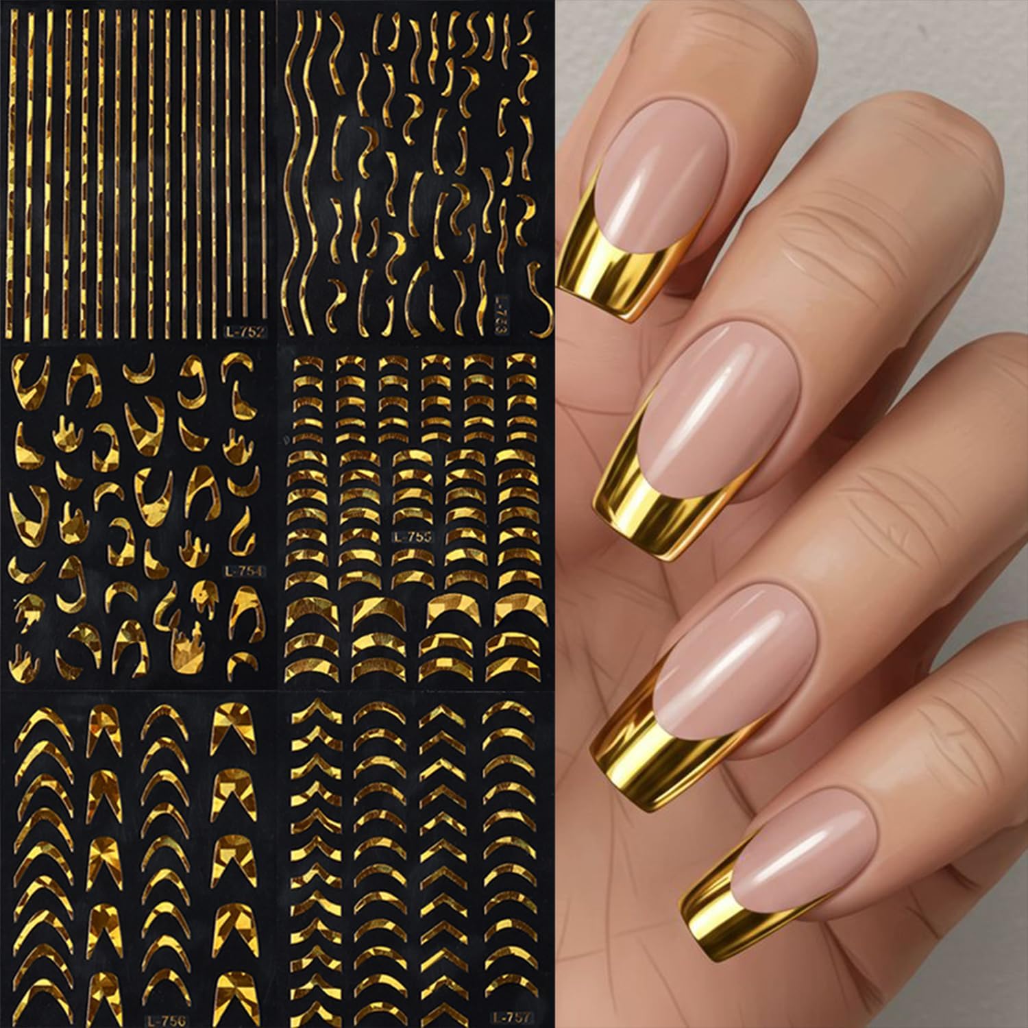 - Quantity: You will get 6 sheets of gold french tip nail art stickers, including lines and stripe pattern designs, not easy to fall off or fade, can easily create a variety of themed nail art
